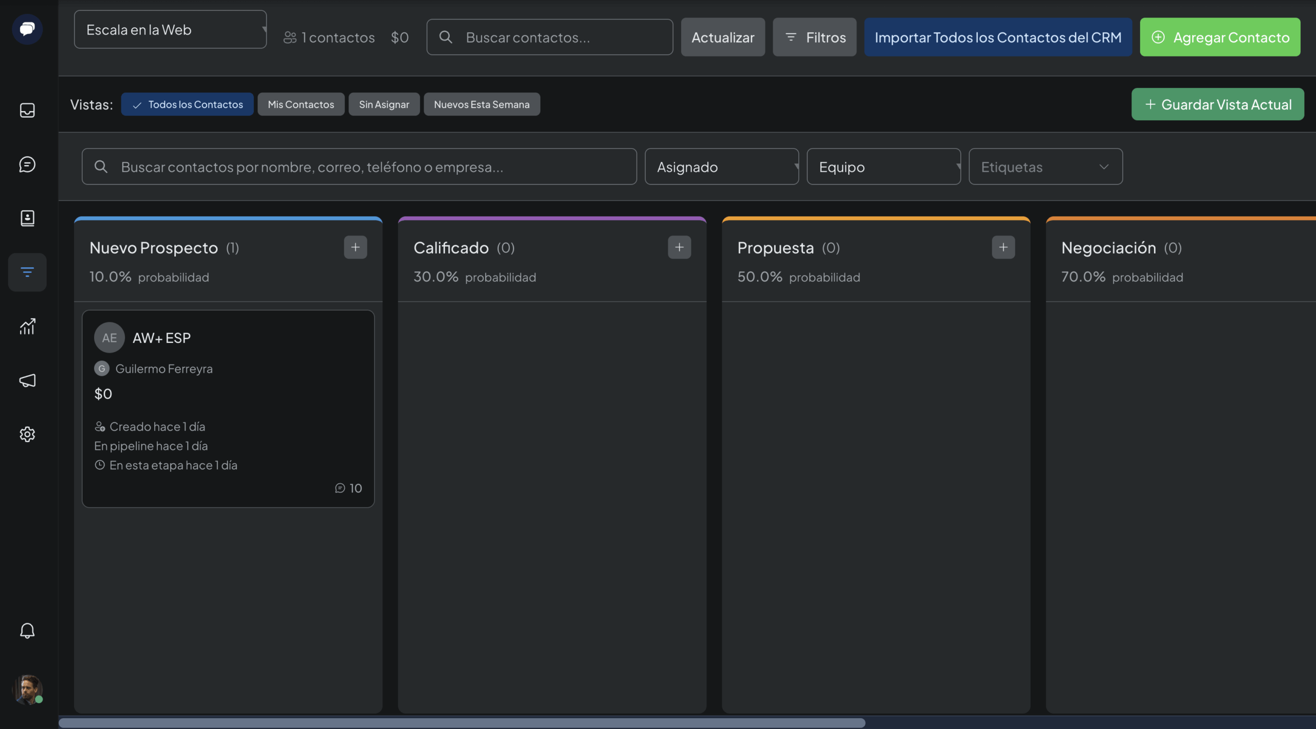 Visualiza y gestiona tu embudo de ventas con una vista Kanban intuitiva. Desde prospecto hasta cierre, mantén el control de cada oportunidad con seguimiento automático del progreso.