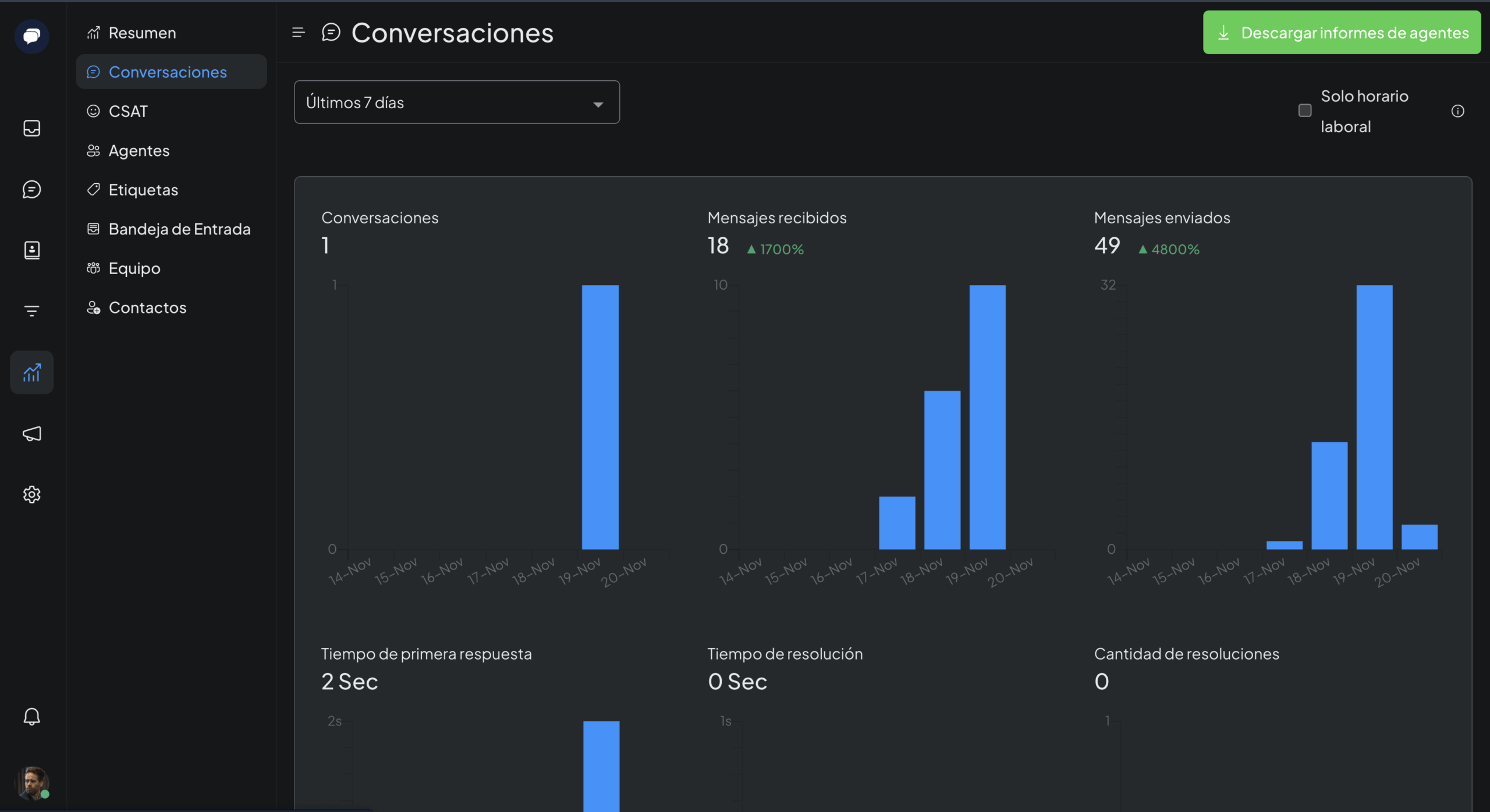 - Reportes de rendimiento por canal, agente IA y campaña