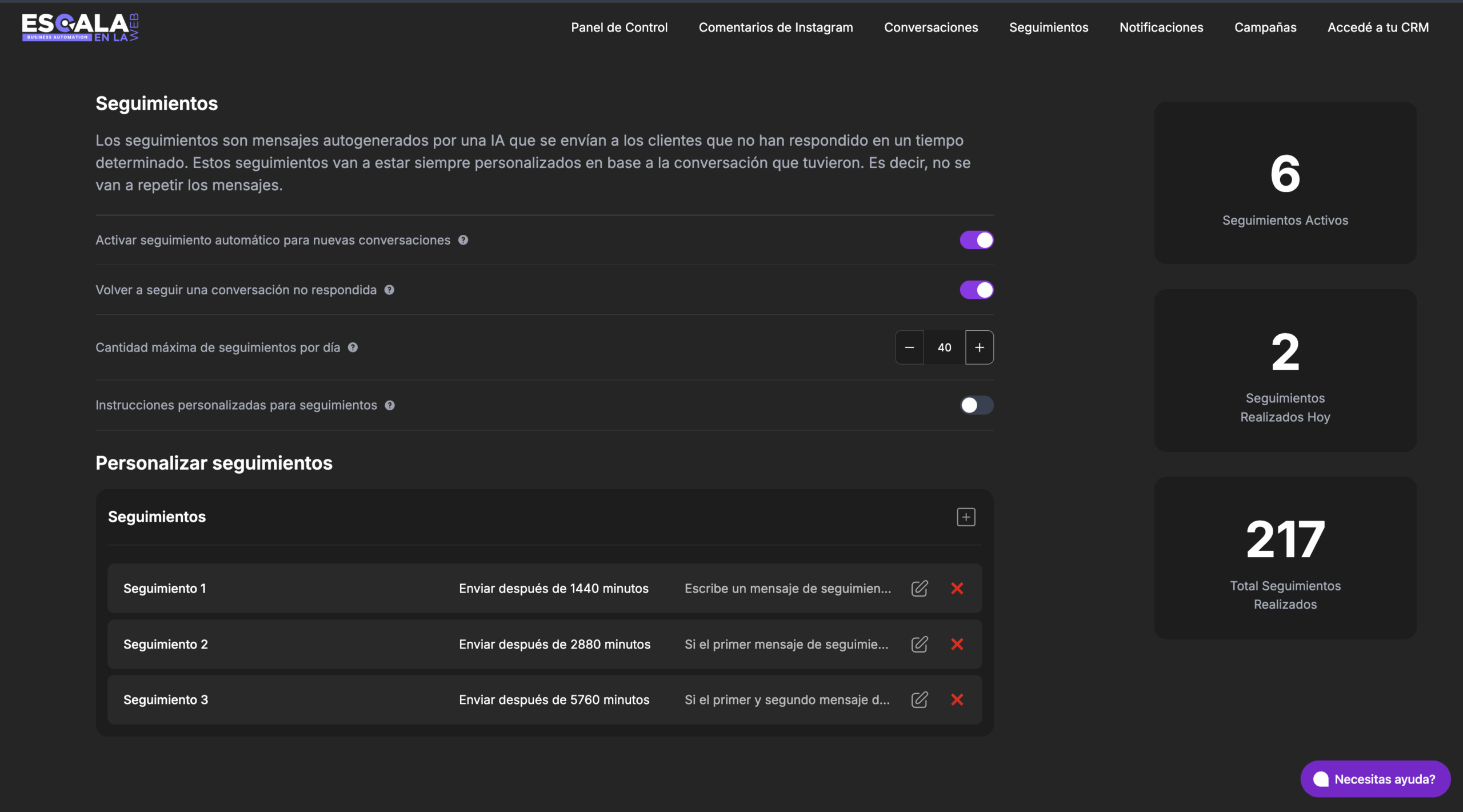 Los seguimientos son mensajes que Escala IA genera y envía de forma automática a los clientes que dejaron de responder después de cierto tiempo. Cada mensaje se adapta al historial de la conversación, por lo que siempre se siente personalizado y relevante, evitando repetir textos genéricos o iguales para todos.